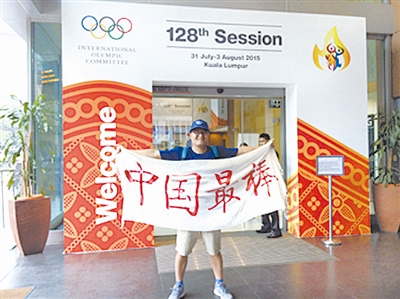 今天,当巴赫宣布北京获得2022年冬奥会举办权时,胡庆伟又赶到吉隆坡会议中心外,举起了那面“中国最棒”的旗帜……
