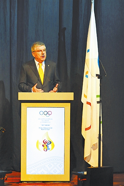 巴赫在国际奥委会第128次全会开幕式上发表演讲。 本报特派记者 郎成 摄