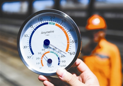 7月29日午后,浙江杭州火车站上水工劳动的铁轨旁热浪翻涌,如左图,一只最高可以显示60摄氏度的温度计已经“爆表”。