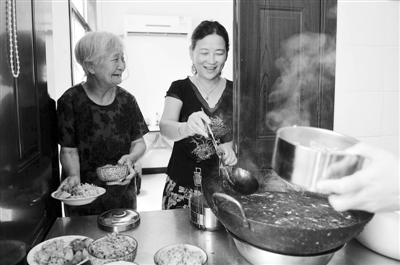 ① 7月31日,在华兴新村社区日间照料中心,志愿者蔡淑莲在为82岁的独居老人孟繁贤(左)打饭。新华社记者 季春鹏 摄