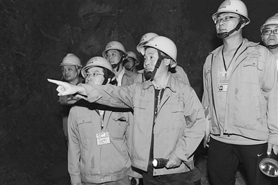 图为项目经理杨建科与工程技术人员在隧道开挖现场研究不同地质结构的开挖爆破方案 。