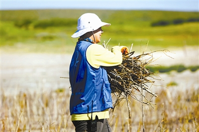 8月4日,一名志愿者在内蒙古宝绍岱诺尔搬运用于制作沙障的红柳枝。