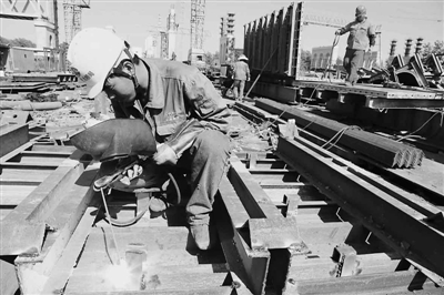 8月2日,在湖北公安长江大桥工地上务工的电焊工尹奇帅和工友们,正在加工钢结构。大桥采用钢模板施工,钢模板加工量近1000吨。工人们虽然错开中午高温时段,但下午4点后的气温仍高达38℃以上。工人们手持电焊枪,满头大汗,身上的衣服几乎没有一处是干的。