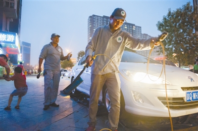 北京的七八月是一年中最热的季节,也是他们接单最多的时候,有时候一个下午就得洗七八辆车。“天儿热,大家都不愿意出去。”周立文解释道,“只需要一个电话,我们就会出现在客户的爱车旁。”