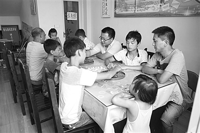 8月4日,在四川省广安市广安区大龙乡果坝村留守儿童托管所,大学生村官彭钒(右一)与党员志愿者在与留守儿童下棋,让留守儿童欢乐过暑假。