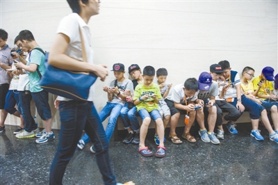 8月6日,北京,中国人民抗日战争纪念馆,一群来此参观的小学生正利用休息时间玩手机。“低头族”这一群体已呈现低龄化的发展趋势。
