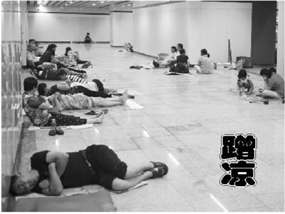 2015年8月4日,上海地铁11号线真如站内连续多日聚集有数十位前来纳凉的市民及外来务工者,其中不仅有人拖家带口,而且有不少纳凉者在站厅内铺着席子躺卧,占据了部分通行路线。东方IC供图