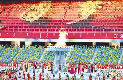 开幕式上,56位民族代表和末棒火炬手张小平一起点燃圣火。本报记者 袁浩 摄