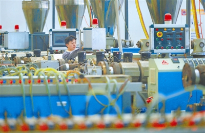8月10日,在河北唐山丰南沿海工业园区,都市宝公司员工在生产线上生产代木型材。该公司对棉花秸秆末等生物质废弃物开展综合开发利用,可将生物质转化为广泛应用于园林景观、建筑外墙等领域的代木型材。新华社发(郑勇 摄)