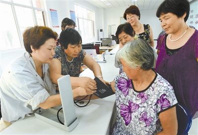 8月12日,香河县安平镇运河生态城回迁社区退休乡镇医生教社区老人如何量血压。