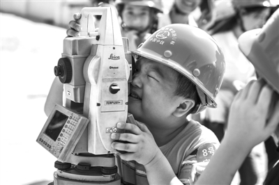 ① 在中铁四局杭黄铁路场口隧道工地,来自苏州的张铭哲体验父亲工作时使用的测绘仪器。戴明阳 张君 摄