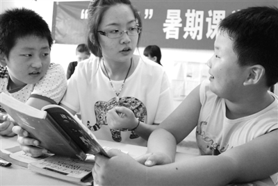 8月12日,大学生在指导外来务工人员子女读书。部分受过资助的大学生利用暑假返乡时段,在江苏镇江农产品批发市场开办“小候鸟”暑期课堂,义务指导这里的外来务工人员子女开展文化、科普等活动,丰富“小候鸟”们的暑期生活。