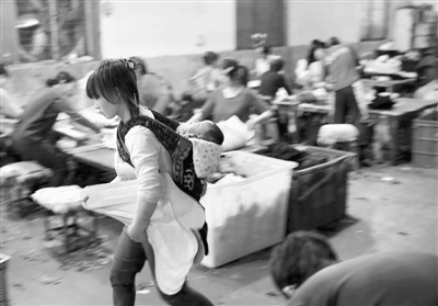 ① 一名年轻的女工背着未满周岁的孩子在车间里穿梭。孩子还不会坐,她只好一直背着。