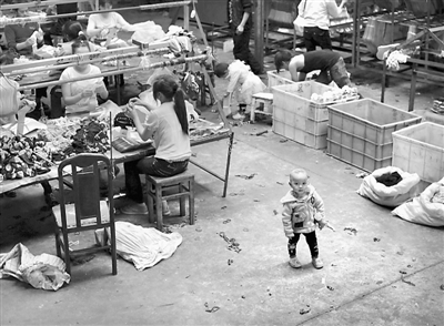 在浙江中部的一个小镇里,散落着一批家庭作坊式的纺织品工厂。每到上班时间,一群学龄前的孩子就会跟着父母来到车间。年轻的父母们舍不得将孩子留在老家,便带着孩子出来上班。