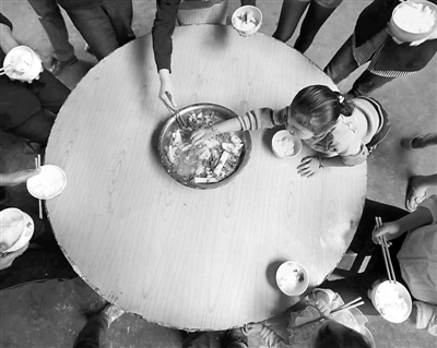 ③ 午餐时,一个小孩在翻找菜中的猪肉。