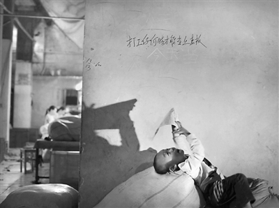 ④ 车间外,一个在翻看宣传单的小孩。墙上有行字:打工仔何时才能当上老板。郭斌 摄
