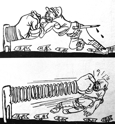 1937年八一三淞沪抗战爆发当月,上海的漫画家们迅速组成了救亡漫画宣传队,领队叶浅予,张乐平是副领队。从城市到乡村,从沿海到内地,到处都有他们的身影,可以说“抗日的炮声到哪里……抗日漫画就出现在哪里”。