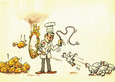 驯兽人穿上工作服变成了厨师,他巧借钻火圈功夫迅速地让家禽变为美味的烧鸡。人们从“变”中看到聪明才智的巨大能量。【法国】麦克