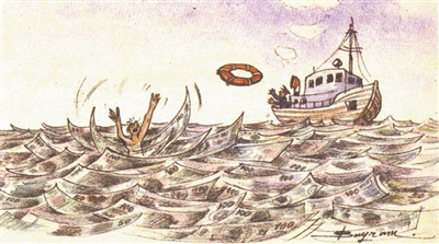 画作言简意赅地揭示贪赃枉法的可悲下场:贪官污吏念弥陀,为富不仁捞钱多,欲壑难填无休止,堕入“海”中身难脱。