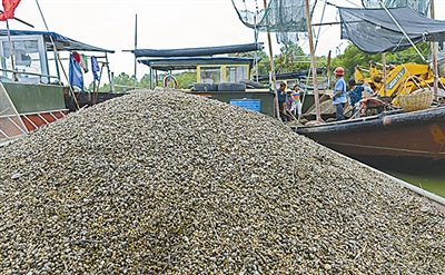 7月22日,在鄱阳湖都昌县一码头,渔民将捕捞的螺蛳卸货装车。 新华社 万象 摄