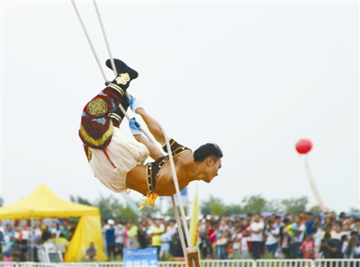 民运会参赛选手表演旋传秋千。本报记者 袁浩摄