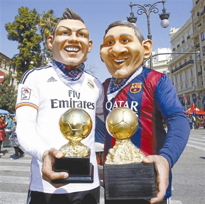 北京时间8月12日,2014~15赛季欧足联最佳球员候选人出炉。巴萨球星梅西和皇马球星C罗一同入围。该奖项将在北京时间8月27日揭晓。图为西班牙球迷头戴两位球星的面具现身街头。CFP/供图