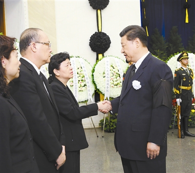 8月16日,尉健行同志遗体在北京八宝山革命公墓火化。习近平、李克强、张德江、俞正声、刘云山、王岐山、张高丽、胡锦涛等前往八宝山送别,江泽民在外地送花圈表示哀悼。这是习近平与尉健行亲属握手,表示深切慰问。