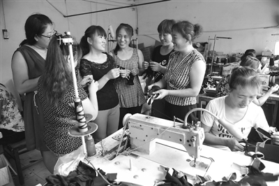 8月16日,河北固安县袁翟村致富带头人崔芳(左三)在自己创办的加工厂里对几名本村妇女进行技术培训。