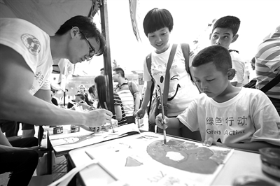 8月16日,在合肥市淮河路步行街,宋嘉良小朋友(右一)在环保袋上画画。