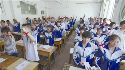 ①距离高考还有一天,甘肃会宁县第一中学的学生手系红色希望丝带为高考加油。