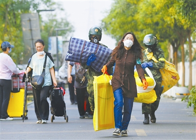 8月17日,在万科海港城,业主在社区工作人员和武警的协助下搬运家中部分物品。