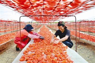据了解,晾晒一公斤番茄干需13公斤鲜番茄,一公斤番茄干售价达20~25元,与番茄制酱售价0.45元/公斤相比,可多增收10元左右。目前,当地加工生产的2000余吨番茄干,因品质高、绿色无公害,已被日本、美国、意大利、巴西等国客商订购一空。新华社发(杜炳勋 摄)
