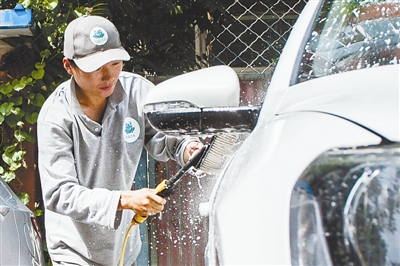 图①一家“互联网+”洗车公司员工正在上门给客户洗车。
