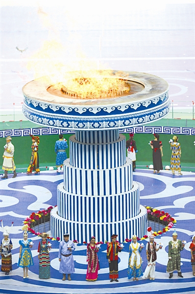 8月17日,体育场内的第十届全国少数民族传统体育运动会圣火即将熄灭。