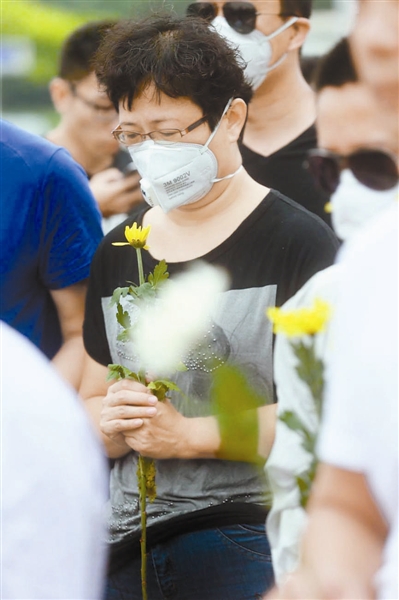 在开发区公安消防支队吊唁灵堂,消防支队的官兵们纷纷脱帽,眼含泪水。自发赶来的市民,每人拿着一束花,鞠躬致哀。