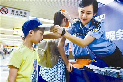 8月19日,深圳罗湖口岸的边检民警向小旅客赠送印有边检吉祥物的帽子。