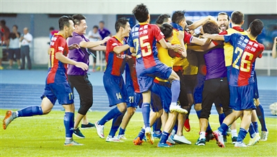 8月19日晚,在足协杯1/4决赛中,北京北控燕京队主场通过点球大战以5比3淘汰贵州人和队。图为获胜后的北京北控燕京队球员欢庆场面。本报记者 许之丰 摄