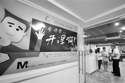 8月19日,在合肥市常青街道的创客·梦空间内,一位互联网公司从业者(右)在对创业路上的年轻人答疑解惑。当日,在安徽合肥市常青创客·梦空间,首堂创业课堂正式开讲。据了解,此次开课的创客·梦讲堂是创客·梦空间的重要组成部分,为创客在创业路上提供把脉问诊、保驾护航的贴心服务。