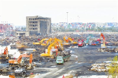 8月21日,救援人员和机械在对焚毁车辆进行清理。当日,天津港“8·12”瑞海公司危险品特别重大火灾爆炸事故进入第9天。最新情况显示,遇难者人数上升至116人;事故核心区已经进入清理阶段;受灾区域小学将如期开学;受损房屋将会得到妥善处置。