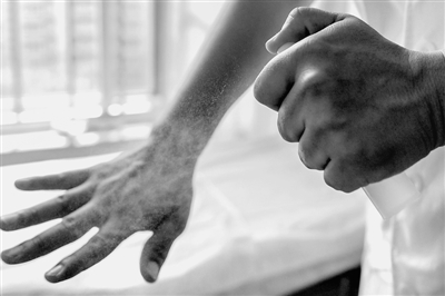 为了让顾客安心,每次按摩前陶震都会用酒精为双手消毒。