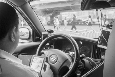 8月20日傍晚,北京市雍和宫桥下。一位正在等红灯的出租车司机抽空看电子书。除此之外,他还时刻留心手机和平板电脑的“滴滴”声,准备抢单。本报记者 吴凡摄
