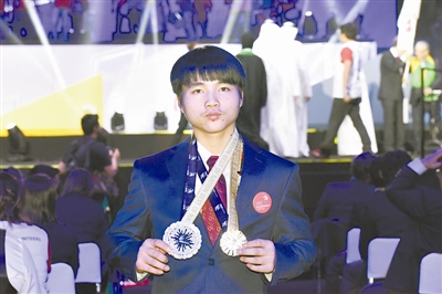 在第43届世界技能大赛闭幕式颁奖式后,焊接项目金牌选手曾正超自豪地举起奖牌。