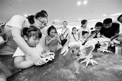 8月23日,一名儿童在家长的帮助下控制机器恐龙。