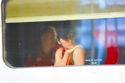 8月23日,在比利时首都布鲁塞尔的火车南站,一名女乘客(右)从“大力士”国际列车内向外张望,一名执勤车站安全人员的影子映在车窗上。