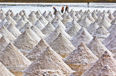近日,西部大型产盐区甘肃省张掖市高台县盐池原盐开铲,当地农户和公司职工将晒好的原盐铲收和拉运。