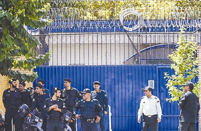 8月23日,在伊朗首都德黑兰,伊朗士兵站在英国驻伊朗大使馆外。