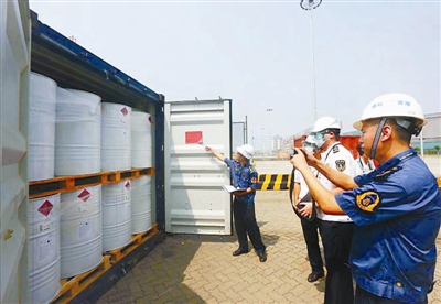 8月24日,广东广州,在南沙港集装箱码头,南沙检验检疫局联合南沙海事处、广州港务局海港分局,开展针对化学危险品的联合检查。