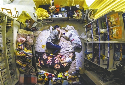 2015年8月13日,成都,金女士和丈夫在动物医院搭建的一个临时“家”中,与宠物狗毛毛相拥而眠。