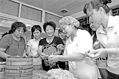 8月25日,参加培训的学员在面点师傅指导下学习包小笼汤包。安徽芜湖市凤凰山社区结合妇女再就业需求,联合辖区耿福兴餐饮公司开展技能培训活动,20多名失业人员参加培训。戚良鹏 王婷 摄