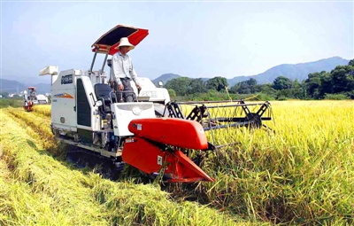 8月26日,江西省宜春市靖安县仁首镇石下村农民驾驶农机在收割中稻。